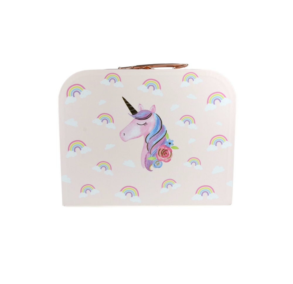 Introducing the enchanting 18-Piece Rainbow Unicorn Tin Tea Mug Set in its whimsical suitcase, a magical ensemble that brings the wonder of unicorns and rainbows to your child's imaginative tea parties! This delightful set features a stunning illustration of a majestic unicorn amidst vibrant rainbows, creating an atmosphere of enchantment and fantasy. Crafted to inspire delightful pretend play, this set is perfect for hosting fantastical tea gatherings with family, friends, or your child's beloved toys.