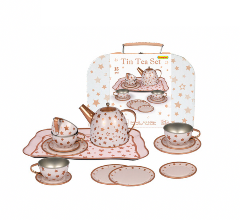 Your child will absolutely love pretend play with this stylish gold star tin tea set. Perfect for their next tea party. Comes in a cut cardboard carry case complete with 4 teacups, plates, tea pot and serving tray.