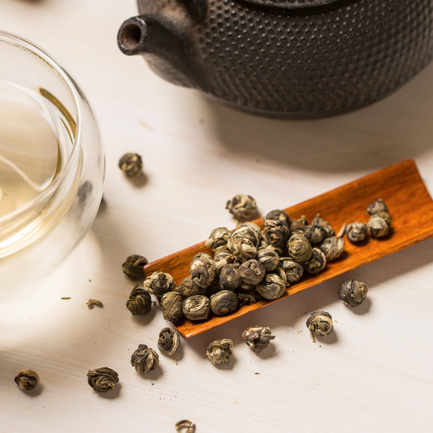 Also known as Buddha's Tears or Jasmine Pearls this is one of the most beloved artisan teas from China. The effort behind this tea is arduous from selection to shaping. Each ball has been carefully hand-rolled from a perfect white bud and leaf which has been infused with the scent of freshly-picked jasmine blossoms. When placed in water, each ball delicately unfurls and produces a light, yellow infusion with a sweet jasmine aroma and flavour.